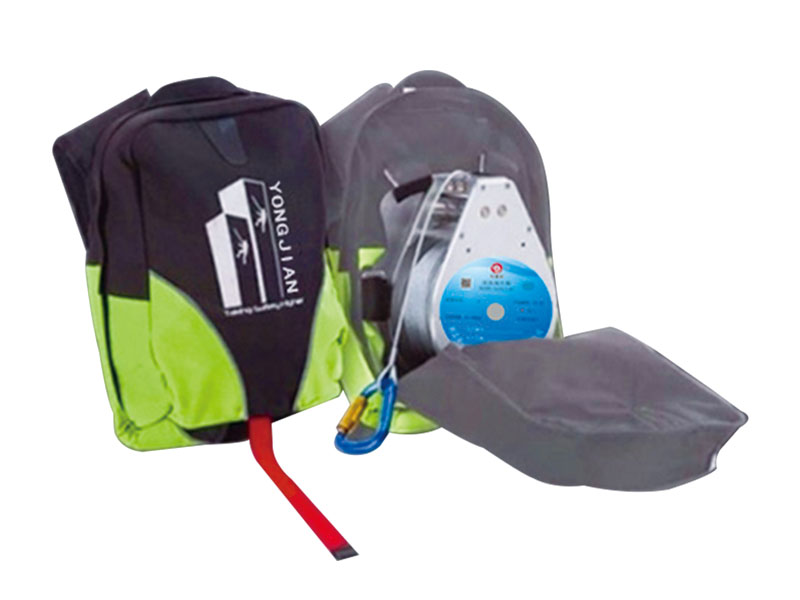 應急逃生器(速降器)由調速器、安全鉤、鋼絲繩、安全帶、背包,調節(jié)扣,掛架組成。